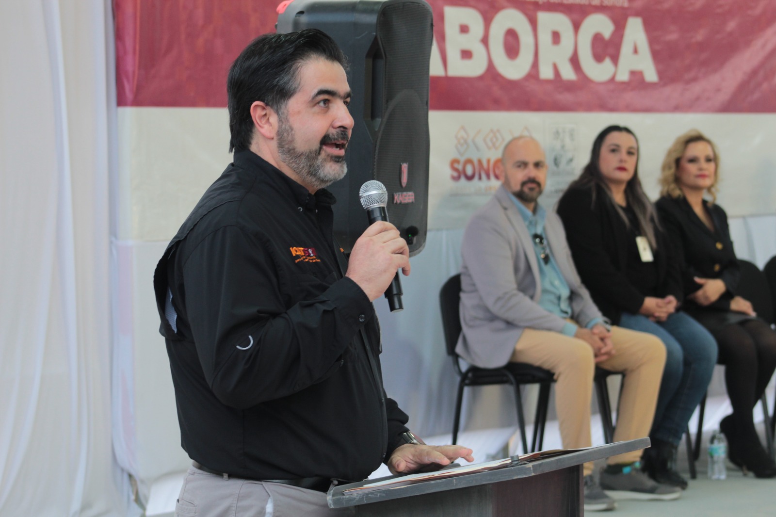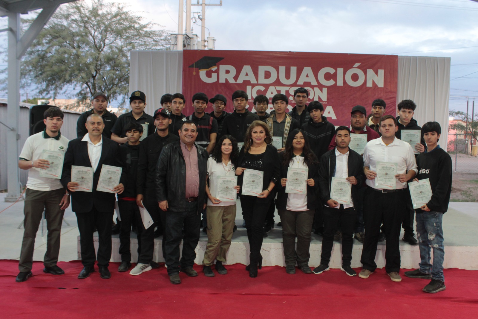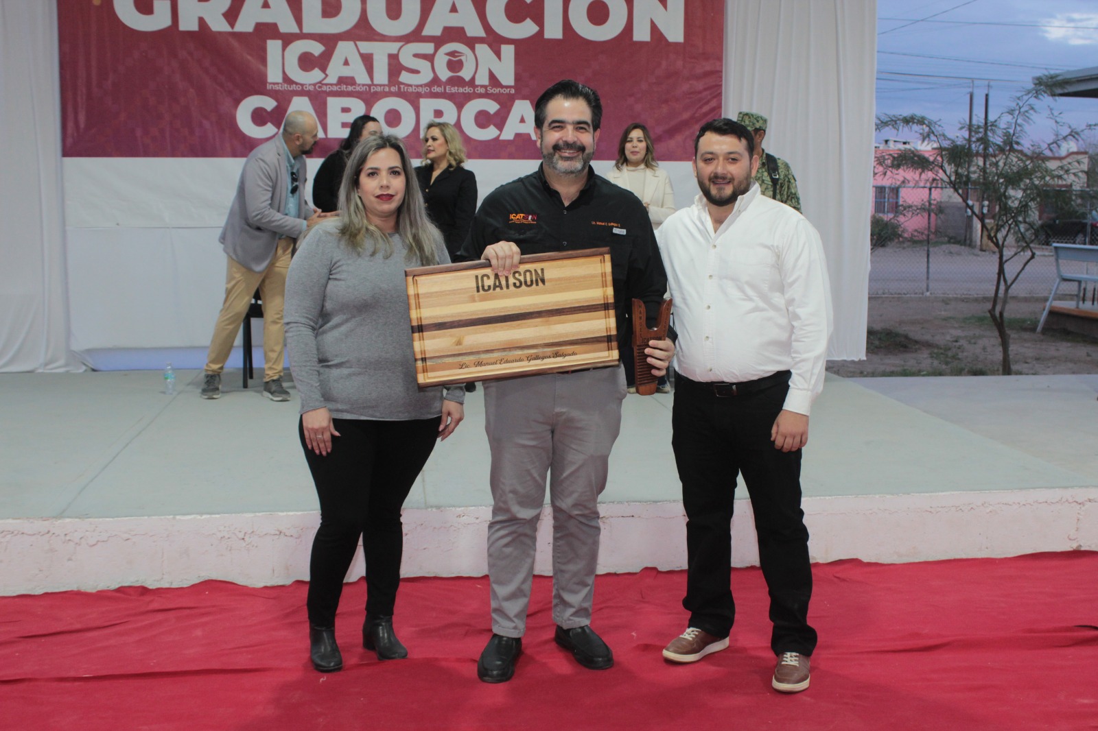 Presentes: en representación del Secretario de Educación y Cultura, Froylán Gámez Gamboa, la Delegada de Educación y Cultura, Laura Elizabeth Arvizu Castro; representando al Secretario del Trabajo, la Inspectora Local, María Dolores Hernández Bon; en representación del alcalde de Caborca Abraham David Mier Nogales, el Director de Cultura, Gabriel Rivera Villalobos; el Segundo Comandante del 28 Regimiento de Caballería, Salvador Ernesto Franco Herrera; el Director General del ICATSON, Manuel Gallegos Salgado; el Secretario Técnico Juan Carlos Rodríguez Esparza, y la Directora del Plantel Caborca, Maribel Trejo López.
